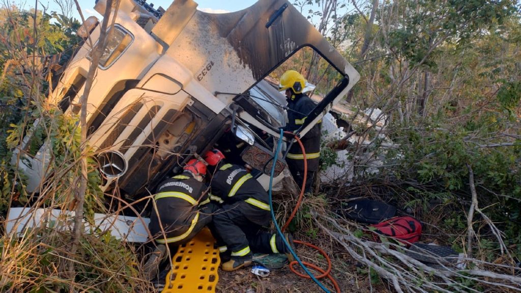 Em Palmeirante, um motorista ficou preso às ferragens de um caminhão que transportava gesso, no sentido Bielândia. O veículo tombou às margens da rodovia. A vítima informou aos bombeiros que estava comendo uma uva quando apagou e não lembra mais o que aconteceu.