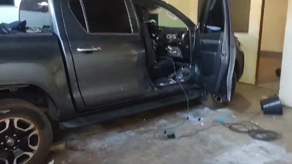 Também foram encontrados jogos de ferramentas usadas para arrombar portas, a bagagem da vítima do furto mais recente, aparelhos bloqueadores de sinal de GPS, dispositivos usados para codificação de chaves e ignição de veículos, placas das outras duas caminhonetes furtadas e um outro carro furtado.